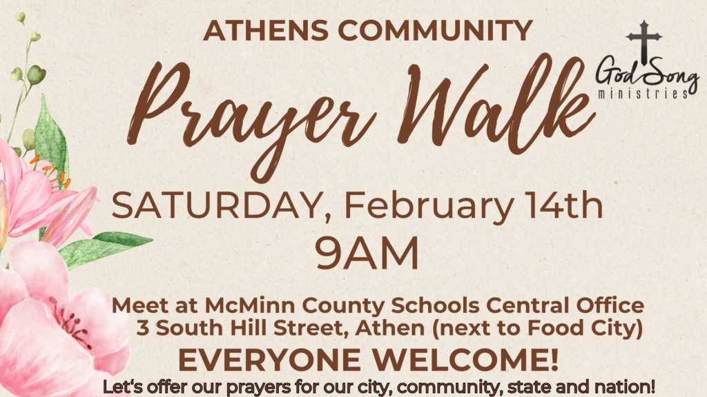 We will meet on the porch of the McMinn County Schools Central Office. The building is located at 3 South Hill St. in Athens, next to the Food City Store. Please join us there if you are able or pray wherever you are! Pray for our communities, our schools and leaders and all the people that live in our area. Pray for healing, pray for our nation, and our local, state and federal government, and anything else the Lord leads you to pray.